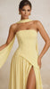 Vestido largo de corte elegante y sofisticado, diseñado para realzar la silueta con un estilo moderno y femenino. Confeccionado en un delicado tono amarillo pastel, aporta luz y frescura, ideal para eventos de primavera y verano.